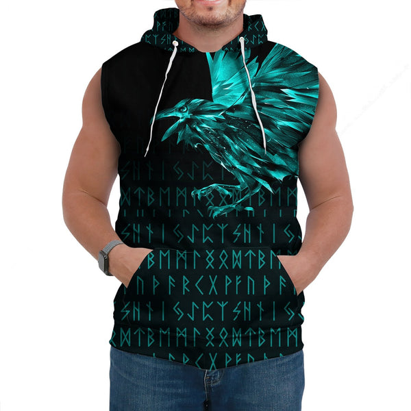 Viking Sleeveless Hoodie The Raven Of Odin Rune Cyan
